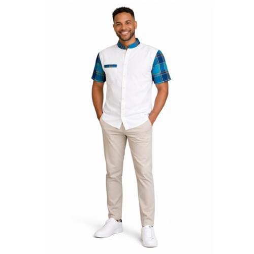 Alliant sobriété et caractère, cette chemise blanche est sublimée par un madras aux accents caraïbéen sur les manches le col et la poche. Sa coupe moderne et son col officier apporte une élégant, idéal pour un look chic ou décontracté de jour comme de soirée.