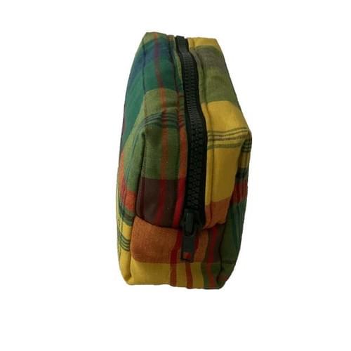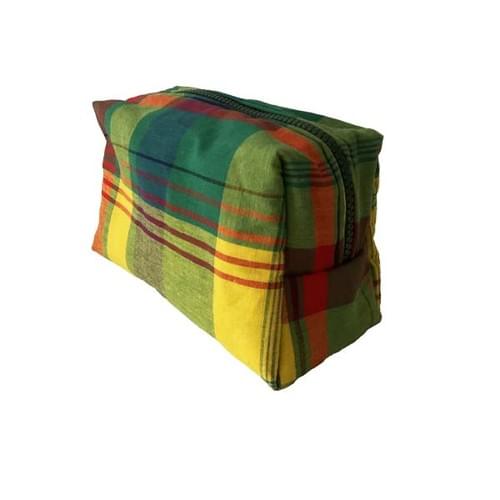 Trousse souple en tissu madras, doublée de satin vert à l'intérieur.